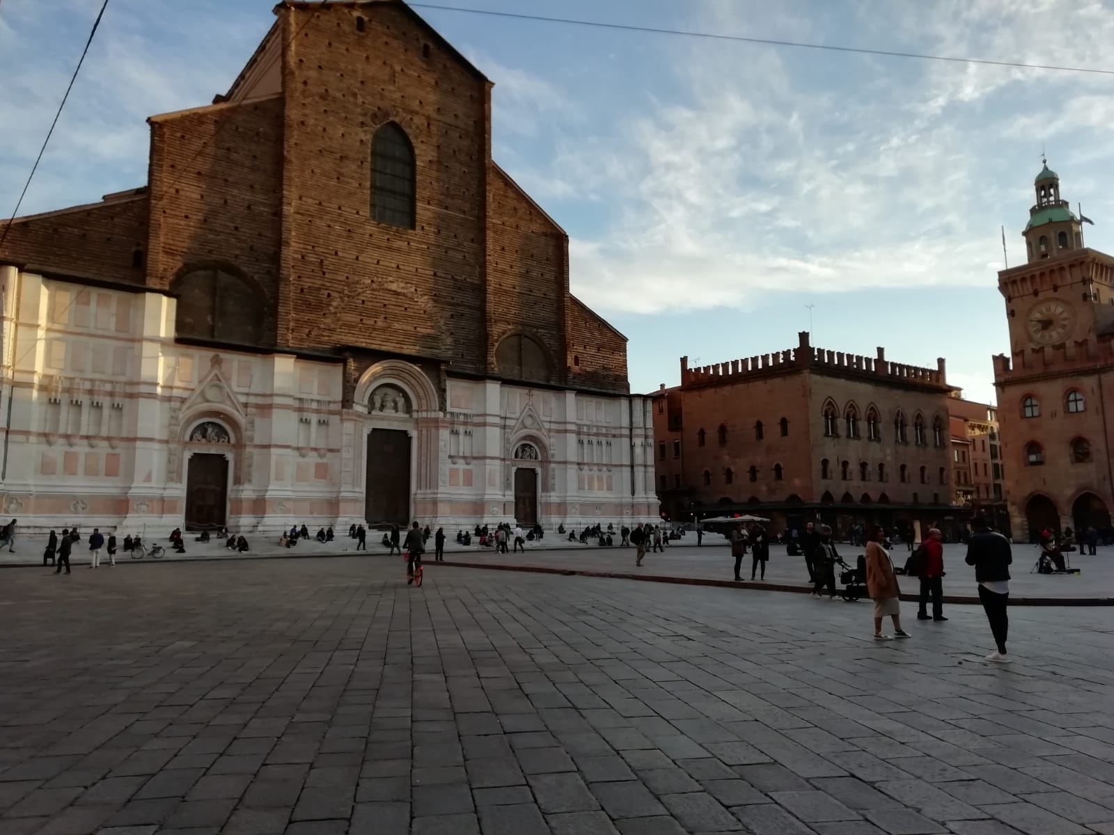 Il centro della città dove San Petronio ti guarda, illuminata per metà dal sole del tramonto con le persone sedute per terra che ammirano una bellezza non voluta. Eh già, San Petronio “una chiesa a metà” che doveva essere completata ma, secondo credenza popolare, per mancanza di fondi è rimasta invece incompleta.