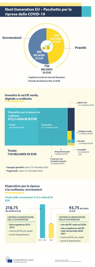 Nell’ottica di ristoro europeo infatti l’Italia è lo stato a cui vengono destinati i fondi maggiori: ben 27,4 miliardi di euro.Se negli anni precedenti siamo stati abituati a politiche di austerity soprattutto nei confronti dei cosiddetti PIGS (Portogallo, Italia, Grecia e Spagna), oggi la pandemia ha fatto sì che si siano intensificati gli sforzi di sostegno reciproco tra i Paesi membri.In tal senso quindi tutti, anche i più scettici, hanno riscoperto il significato della parola Unione.