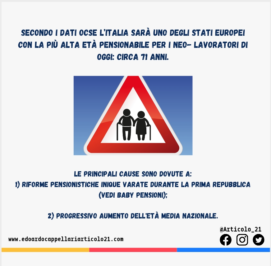 Secondo i dati Ocse l’Italia, grazie anche alla legge Dini che prevede un calcolo pensionistico totalmente contributivo, sarà uno degli Stati europei con la più alta età pensionabile per i neo- lavoratori di oggi: circa 71 anni.