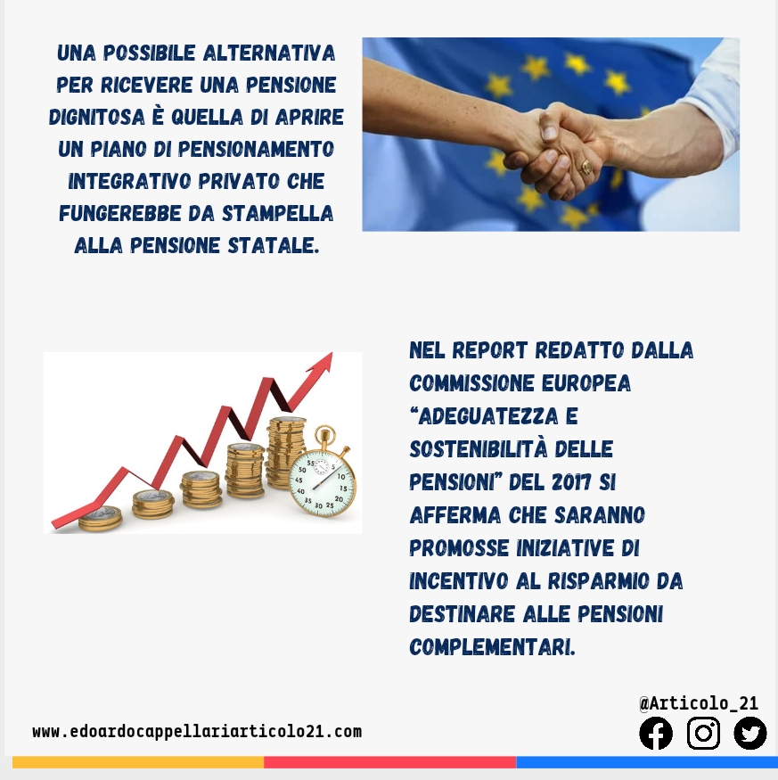 A tal proposito il Presidente del Consiglio Mario Draghi vede come possibile alternativa una pratica da sempre utilizzata nei Paesi con meno welfare “statale” rispetto ai Membri dell’Unione: quella del pensionamento integrativo privato che fungerebbe da stampella alla pensione statale. Anche nel report redatto dalla Commissione europea “ADEGUATEZZA E SOSTENIBILITÀ DELLE PENSIONI” del 2017 si afferma che nei Paesi dove la spesa pensionistica pubblica è destinata a diminuire (vedi Croazia, Danimarca, Francia, Italia, Lettonia) saranno promosse iniziative di incentivo al risparmio complementare da destinare alle pensioni.