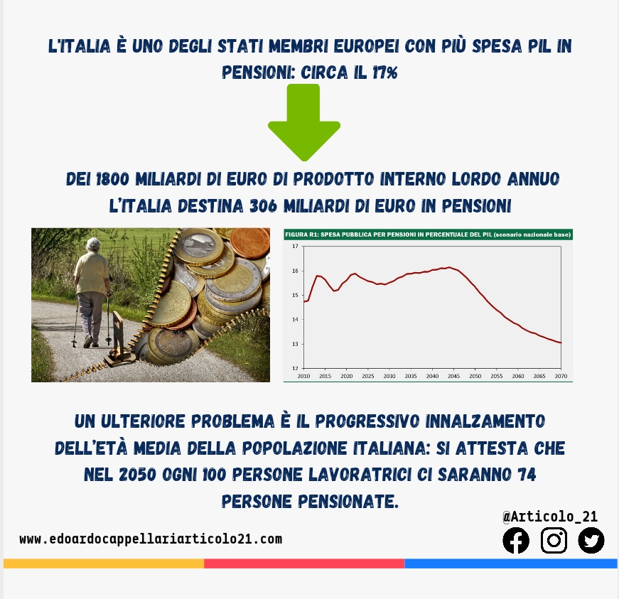 A causa dell’aumento progressivo dell’età media della popolazione e a riforme pensionistiche inique varate negli anni della Prima Repubblica (vedi baby pensioni) ad oggi si stima che con il puro sistema contributivo per ricevere una pensione che sia almeno una volta e mezzo l’assegno sociale (circa 700 euro) bisognerà lavorare oltre i 70 anni. Gli alti benefici elargiti a pensionati relativamente giovani che l’Italia ha concesso dal secondo dopoguerra fino alla riforma del ’95 ha di fatto posto il Bel Paese nelle condizioni di essere uno degli Stati membri europei con più spesa PIL in pensioni: circa il 17%. Per tradurlo in cifre facilmente comprensibili significa che dei 1800 miliardi di euro di prodotto interno lordo annuo l’Italia destina 306 miliardi di euro in pensioni (dato destinato a calare). Ulteriore “problema” è il progressivo innalzamento dell’età media della popolazione italiana: si attesta che nel 2050 ogni 100 persone lavoratrici ci saranno 74 persone pensionate.