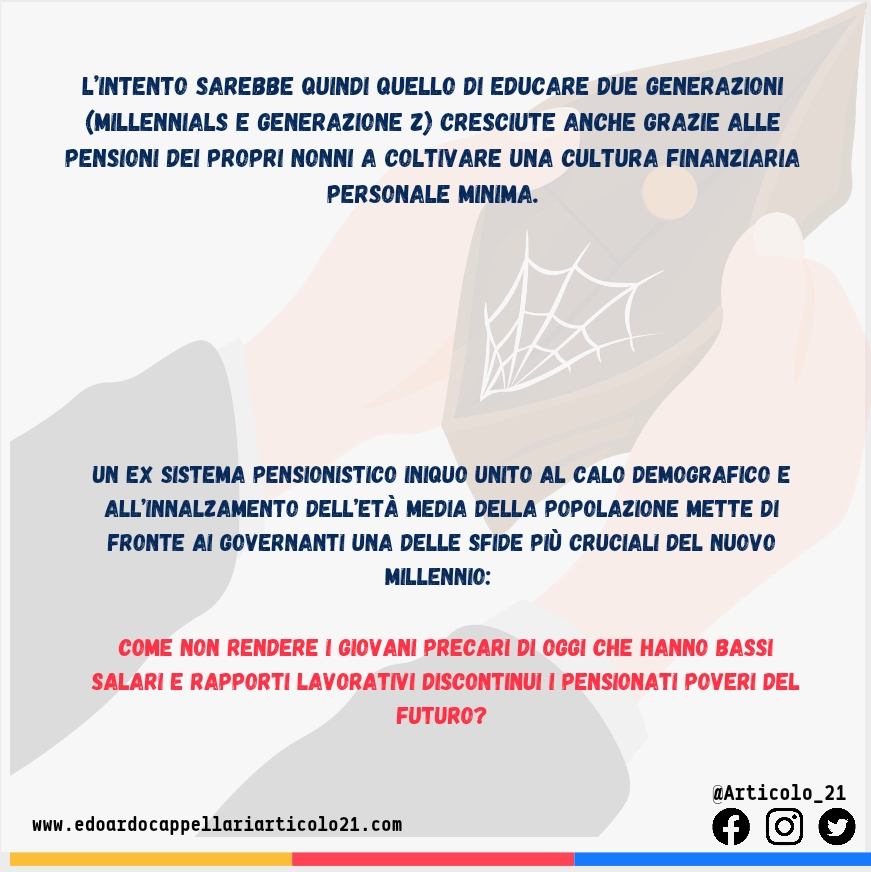 L’intento sarebbe quindi quello di educare due generazioni (Millennials e Generazione Z) cresciute anche grazie alle pensioni dei propri nonni a coltivare una cultura finanziaria personale minima.